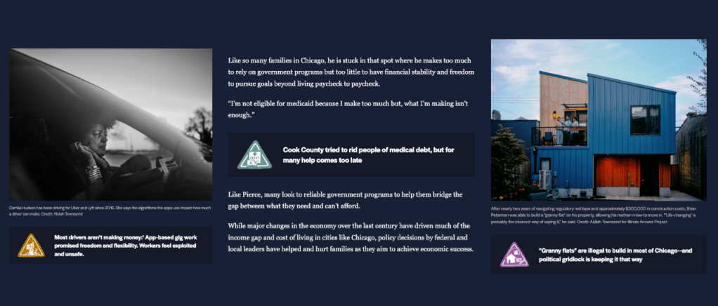 This year we partnered Illinois Answers Project on three projects. The largest one was Making it in Chicago, a suite of reporting that details the barriers Chicago residents face on their quest for economic security. For this project, Cori worked closely with the editorial team, meeting weekly over the course of two months to build the visual narrative tying the suite of articles together. Because of the collaborative process, Cori was able to integrate illustrations and iconography to the suite.